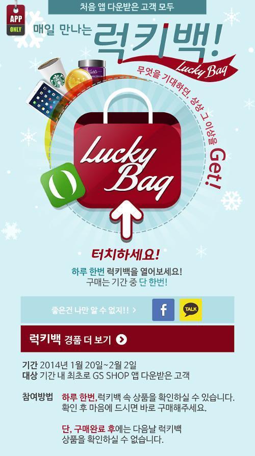 GS샵이 '럭키백' 이벤트가 누리꾼들의 관심 속에 '화제어'로 등극했다. GS샵은 20일 새로 모바일 애플리케이션을 다운로드하는 고객들을 대상으로 '럭키백' 이벤트를 실시한다. .