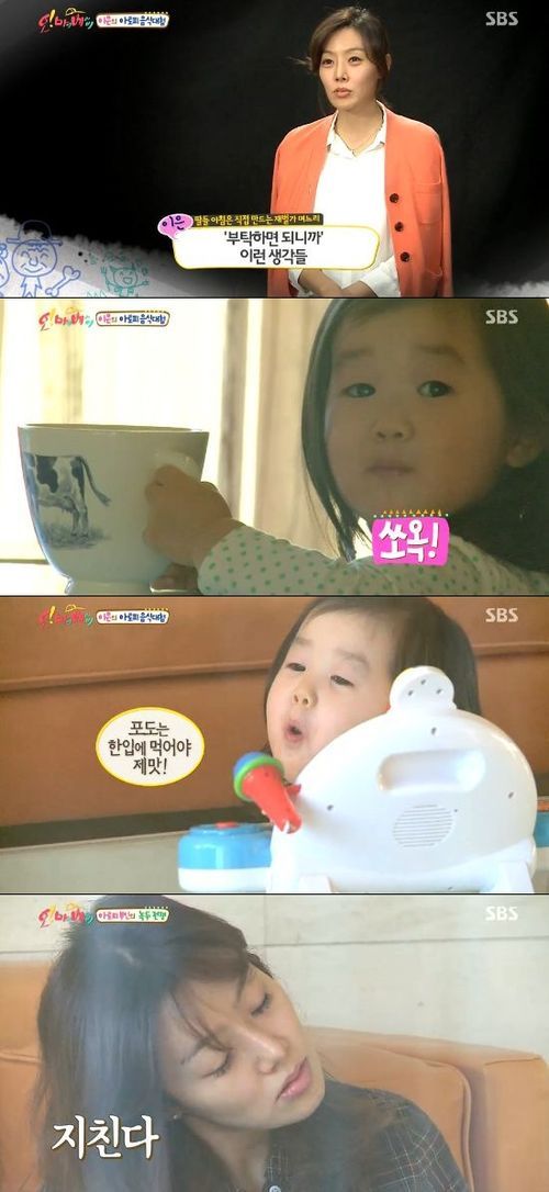 이은은 "도우미를 쓸 수도 있지만, 그 다음이 너무 쉬워질 것 같았다. 아플 때는 엄마의 손 맛이 그리워지는 법인데, 도우미를 쓰면 그런 것을 느낄 수 없다"고 육아법을 설명했다.