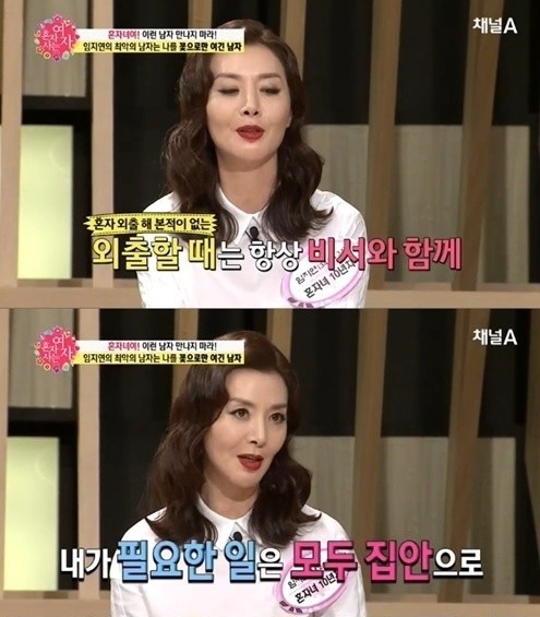 이혼한지 10년 가량 지났다고 밝힌 임지연은 "전 남편은 날 꽃으로만 생각했던 것 같다"면서 "(전 남편과 살 때에는) 혼자 외출해본 적이 없다. 항상 비서와 함께였다"고 고백했다.