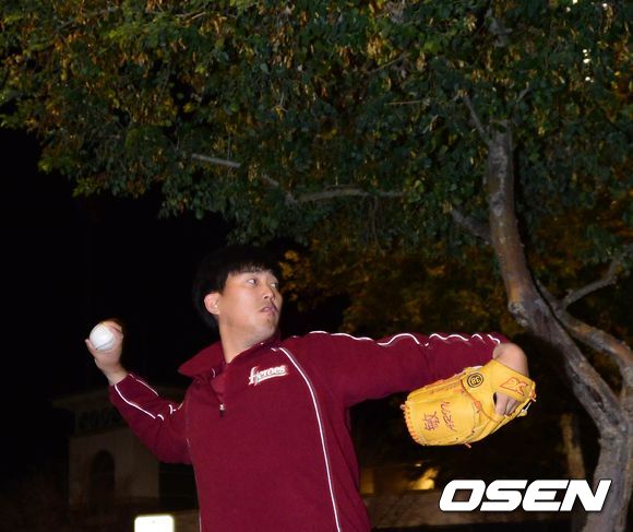 저녁 식사 후 벌어진 야간훈련에서 김영민이 쉐도우 피칭을 하고 있다./spjj@osen.co.kr