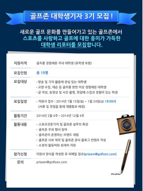 골프존 대학생 기자는 오는 1월 24일까지 접수하며 골프존 기업 블로그(http://story.golfzon.com)에서 지원서를 다운로드 받은 후 이메일(prteam@golfzon.com)로 제출하면 된다. 활동기간은 선정된 후부터 2014년 연말까지이다.