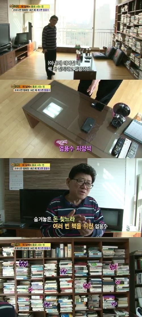 엄용수는 21일 방송된 KBS 2TV '여유만만'에 출연해 혼자 살고 있는 집을 공개해 눈길을 끌었다. 벽 한 명이 책으로 채워져 있었으며, 단출하고 깔끔한 인테리어를 특징으로 했다.