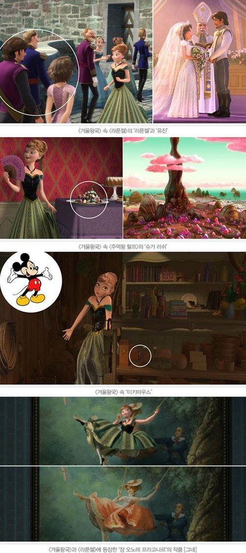 또 안나가 노래 'For The First Time In Forever'를 부를 때 함께 보이는 식탁 위의 초콜릿 접시는 '주먹왕 랄프'의 슈가 러쉬이며, 안나가 소파 위로 뛰어오르며 흉내를 내는 그림은 '라푼젤'에서도 등장했던 장 오고네 프라고나르의 작품 '그네'를 모티프로 한 것과 동일하다.
