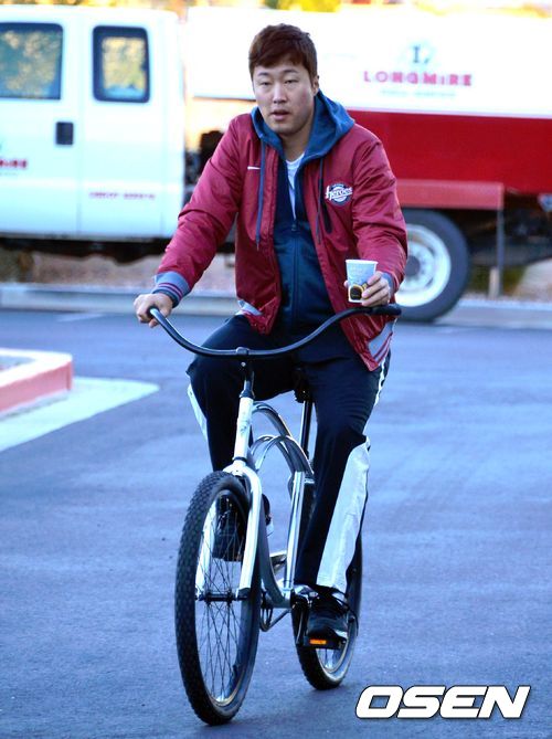 박성훈이 한 손에 커피를 들고 아침 일찍 자전거를 타고 훈련장으로 이동하고 있다./spjj@osen.co.kr