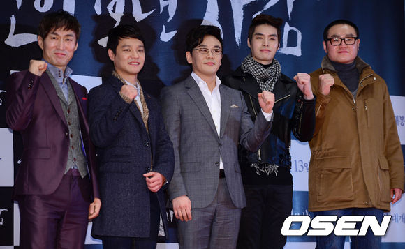 22일 오전 서울 아차산로 롯데시네마 건대입구에서 열린 영화 '신이 보낸 사람' 제작보고회에서 (왼쪽부터) 조덕제, 홍경인, 김인권, 지용석, 김진무 감독이 포토타임을 갖고 있다.