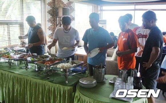 사이판 1차 캠프에서 담금질 중인 롯데 자이언츠 투수들이 22일 한식 뷔페에서 점심을 먹고 있다. 롯데는 지난 15일부터 3월 4일까지 49일간 미국 애리조나와 사이판 그리고 일본 가고시마에서 2014시즌 해외 전지훈련을 실시한다.