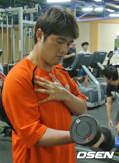 롯데 자이언츠 투수 정대현이 22일 1차 캠프가 차려진 사이판의 한 피트니스 센터에서 체력 훈련을 소화하고 있다. 롯데는 지난 15일부터 3월 4일까지 49일간 미국 애리조나와 사이판 그리고 일본 가고시마에서 2014시즌 해외 전지훈련을 실시한다.