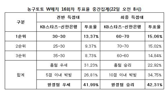 최종 KB스타즈 60점대-신한은행 70점대 15.06%로 최다 집계…23일(목) 오후 6시 50분 마감