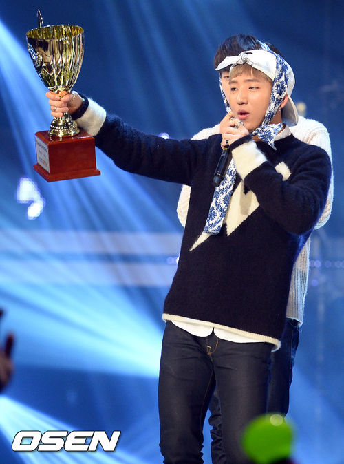 쇼 챔피언송을 차지한 B1A4가 기뻐하고 있다.