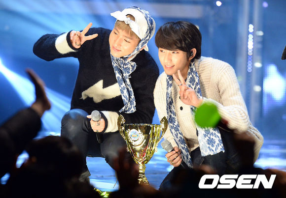 쇼 챔피언송을 차지한 B1A4가 기뻐하고 있다.