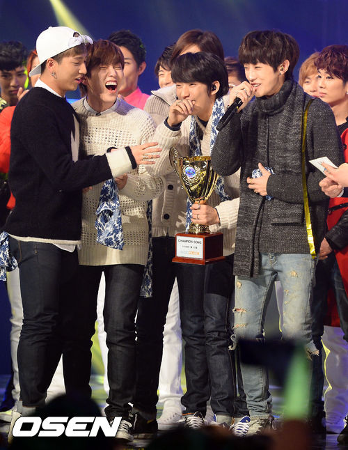 쇼 챔피언송을 차지한 B1A4가 기뻐하고 있다.