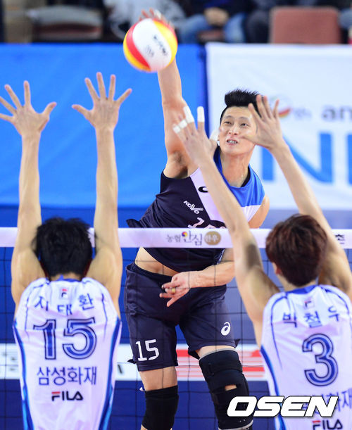 22일 오후 충남 천안시 유관순체육관에서 열린 '2013-2014 NH농협 V리그' 남자부 현대캐피탈과 삼성화재의 경기 1세트 문성민이 공격을 시도하고 있다.
