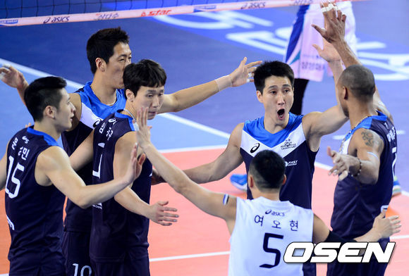 22일 오후 충남 천안시 유관순체육관에서 열린 '2013-2014 NH농협 V리그' 남자부 현대캐피탈과 삼성화재의 경기 2세트 현대캐피탈 선수들이 득점 후 기뻐하고 있다.