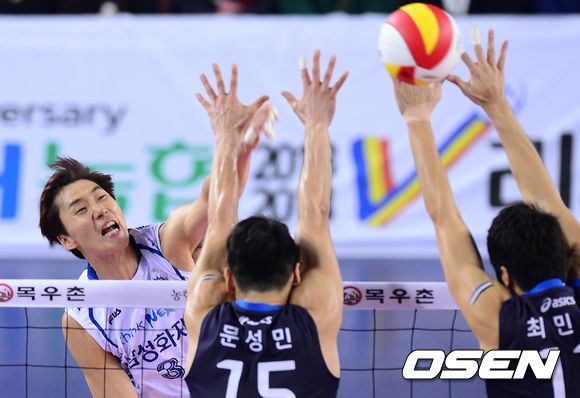 22일 오후 충남 천안시 유관순체육관에서 열린 '2013-2014 NH농협 V리그' 남자부 현대캐피탈과 삼성화재의 경기 2세트 박철우가 공격을 시도하고 있다.