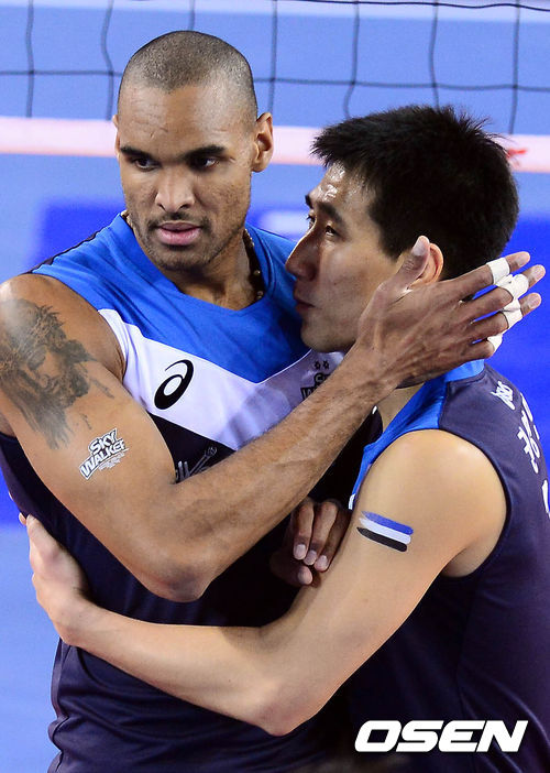 22일 오후 충남 천안시 유관순체육관에서 열린 '2013-2014 NH농협 V리그' 남자부 현대캐피탈과 삼성화재의 경기 2세트 아가메즈와 권영민이 서로를 격려하고 있다.