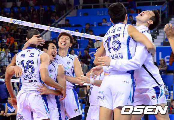 22일 오후 충남 천안시 유관순체육관에서 열린 '2013-2014 NH농협 V리그' 남자부 현대캐피탈과 삼성화재의 경기 종료 후 삼성화재 선수들이 승리를 기뻐하고 있다.