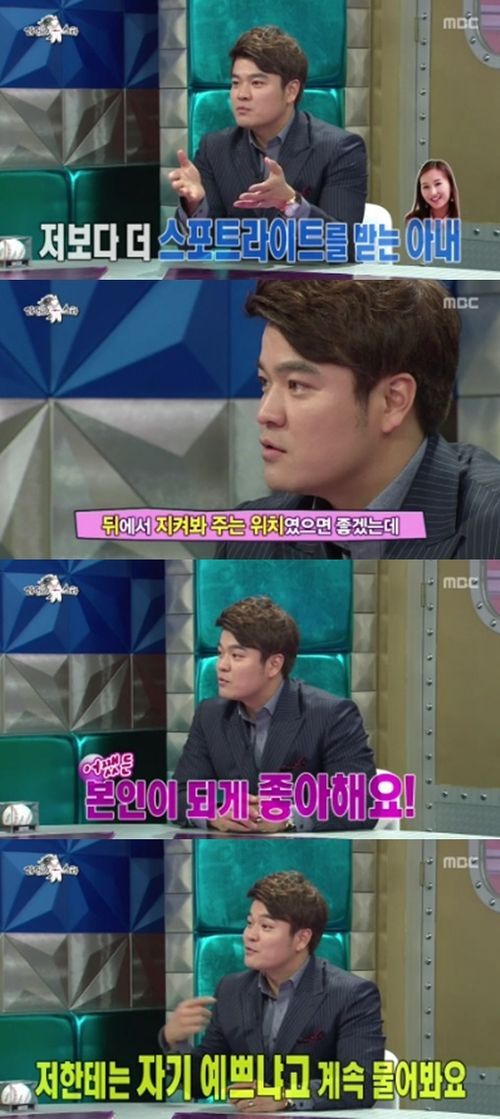 그는 "개인적으로는 아내가 뒤에서 지켜봐주는 위치였으면 좋겠다"며 "아내가 자꾸 자기 예쁘냐고 물어본다. 그럴 때마다 겸손하라고 말해준다"고 전했다.