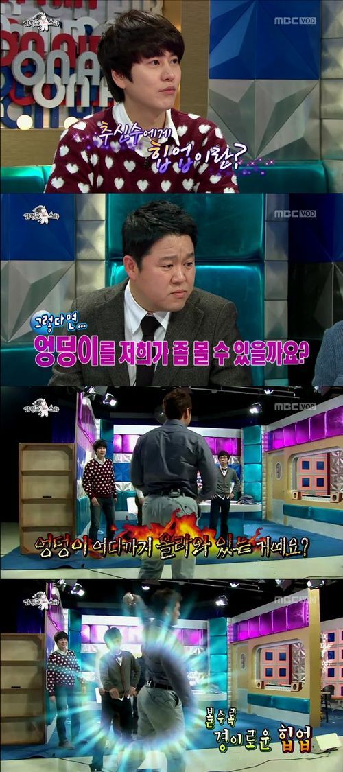 MC들의 뜨거운 호응에 추신수는 부끄러워 하면서도 성실하게 엉덩이에 대한 자부심을 드러냈다. "시즌 때에는 조금 더 업이 돼 있다"고 설명하는가 하면, '추신수에게 힙업이란?'이라는 질문에 "남자의 자존심"이라고 답했다.