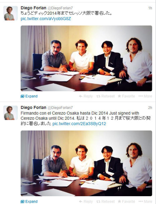 세레소 오사카가 거물급 공격수 영입에 성공했다. 현역 우루과이 대표팀 공격수 디에고 포를란(35, 인터나시오날)의 영입을 확정지은 것이다. 23일(이하 한국시간) 포를란은 자신의 트위터를 통해 "세레소 오사카에서 2014년 12월까지 뛰기로 서명을 했다"며 자신과 세레소 오사카의 계약 모습이 담긴 사진을 공개했다.