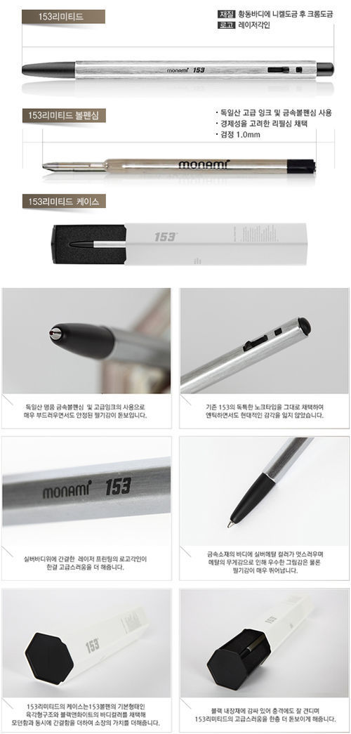 모나미에 따르면 '모나미 153 한정판'은 실버 니켈도금 위에 레이저 '모나미 153' 로고가 레이저로 프린팅 돼 한결 고급스러움을 더 해주고 있다.