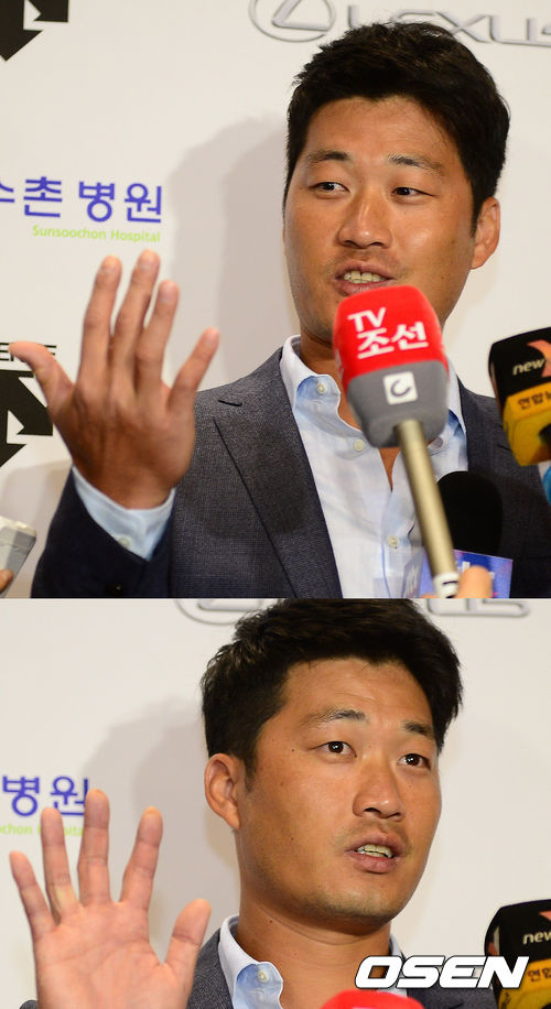 오승환이 인터뷰를 하며 굳은 살이 박인 손을 바라보고 있다.