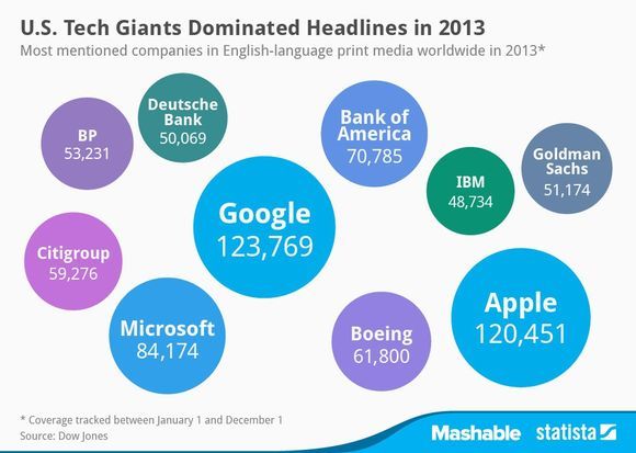 IT전문 외신 매셔블은 23일(한국시간) "2013년 뉴스 헤드라인을 가장 많이 장식한 회사는 구글과 애플이다"라고 보도했다.