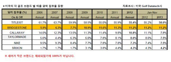 (주)석교상사는 최근 미국 골프 데이터 테크사(Golf Datatech사, 미국 골프 관련 점유율 등을 조사하는 회사) 최신자료를 인용, 일본 브리지스톤 골프의 골프 공이 미국에서는 꾸준히 4년 연속 2위를 기록했다고 밝혔다. 이번 자료는 지난 2013년 1월부터 11월까지의 자료를 바탕으로 한 것이다.