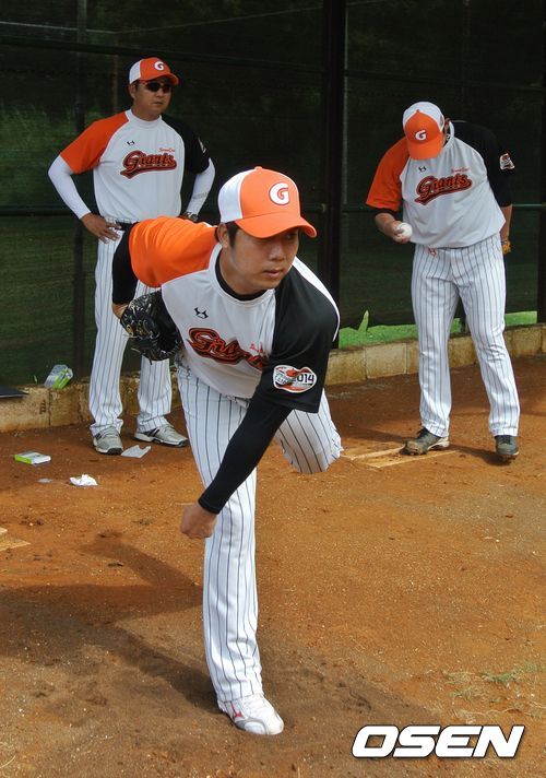 롯데 자이언츠 투수 장원준이 23일 1차 캠프가 차려진 사이판 마리아나 구장에서 정민태 투수 코치가 지켜보는 가운데 첫 번째 불펜 피칭을 소화하고 있다. 롯데는 지난 15일부터 3월 4일까지 49일간 미국 애리조나와 사이판 그리고 일본 가고시마에서 2014시즌 해외 전지훈련을 실시한다.