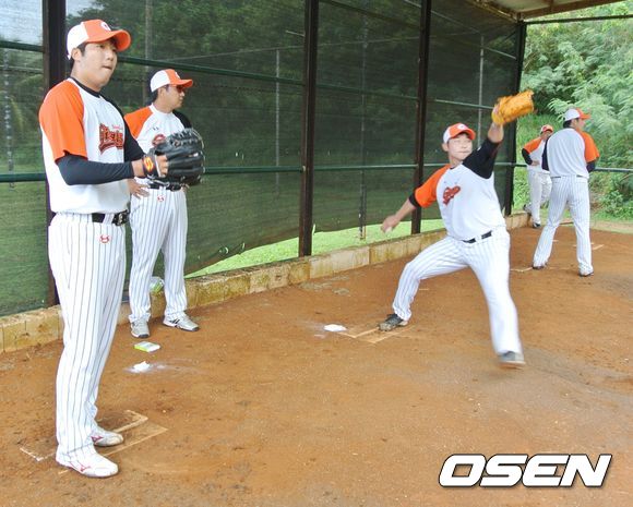 롯데 자이언츠 투수 최대성이 23일 1차 캠프가 차려진 사이판 마리아나 구장에서 정민태 투수 코치가 지켜보는 가운데 불펜 피칭을 소화하고 있다. 롯데는 지난 15일부터 3월 4일까지 49일간 미국 애리조나와 사이판 그리고 일본 가고시마에서 2014시즌 해외 전지훈련을 실시한다.