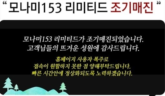결국 모나미 홈페이지는 '모나미 153 리미티드 조기매진' 안내문구를 내면서 품절을 선언했다. 모니미사측은 '모나미 153 리미티드가 조기매진되었습니다. 고객님들의 뜨거운성원에 감사드립니다'라는 말고 고마음을 전했다.