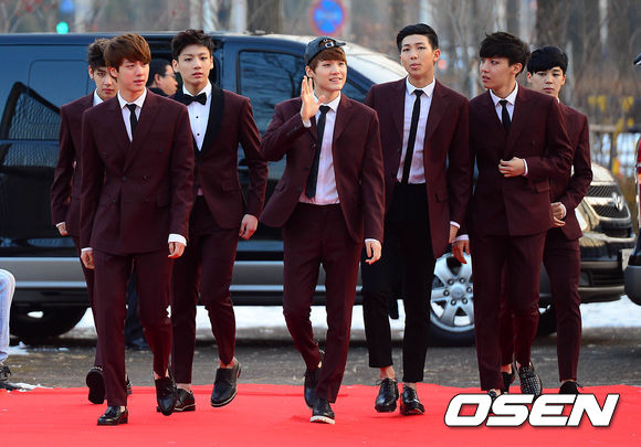 그룹 방탄소년단이 레드카펫을 밟고 있다.
