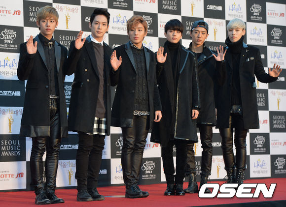 그룹 B.A.P가 참석해 포토타임을 갖고 있다.