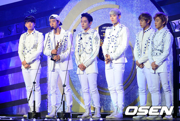 본상을 수상한 그룹 B.A.P가 수상소감을 말하고 있다.