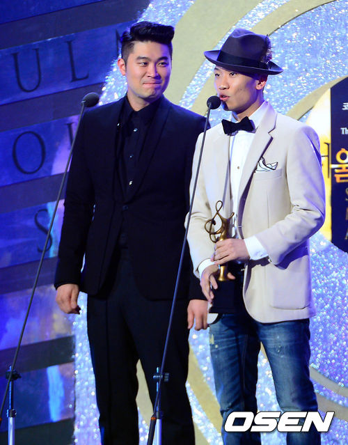 힙합부문상을 수상한 그룹 다이나믹 듀오가 수상소감을 말하고 있다.