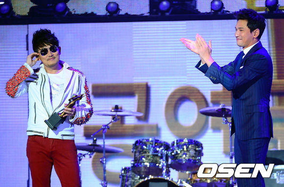 공연문화상을 수상한 이승철이 시상자로 나선 배우 황정민에게 박수를 받고 있다.