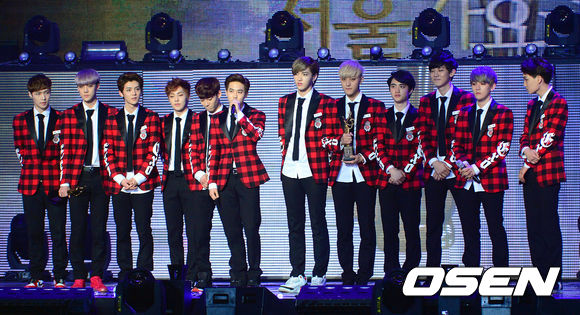 대상을 수상한 그룹 엑소가 수상소감을 말하고 있다.