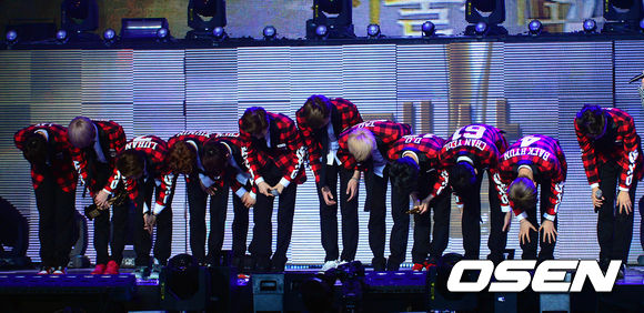 대상을 수상한 그룹 엑소가 관중석을 향해 인사를 하고 다.