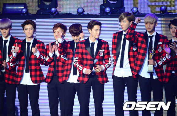 대상을 수상한 그룹 엑소가 수상소감을 말하고 있다.