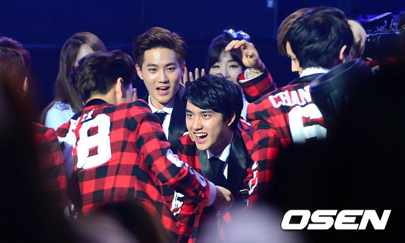 대상을 수상한 그룹 엑소가 동료들의 축하를 받고 있다.
