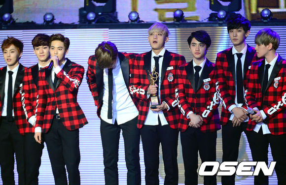 그룹 엑소가 대상 수상 소감을 말하고 있다.