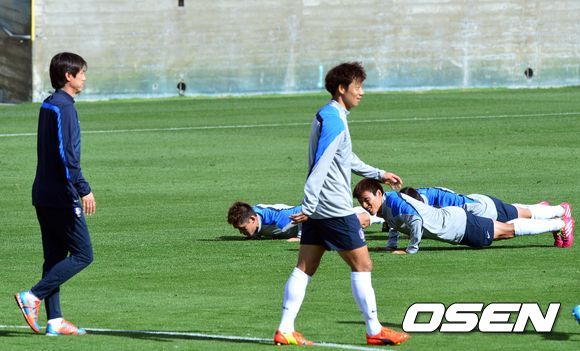슈팅 훈련에서 골을 넣지 못한 선수들이 푸쉬업을 하고 있다./spjj@osen.co.kr