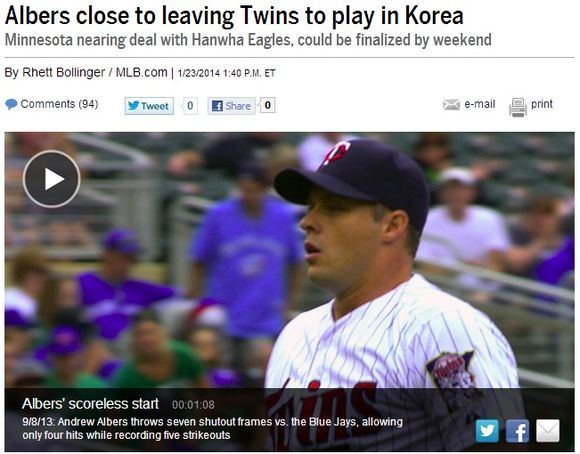 미네소타는 올 겨울 FA 시장에서 선발투수 리키 놀라스코와 필 휴즈를 영입하며 적극적으로 움직였고, 앨버스는 점점 후순위로 밀렸다. 결국 한국에서 온 제안을 뿌리치지 못했고, 이적료 협상까지 원만하게 진행돼 결국 한화 유니폼을 입게 될 전망이다.