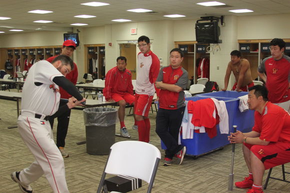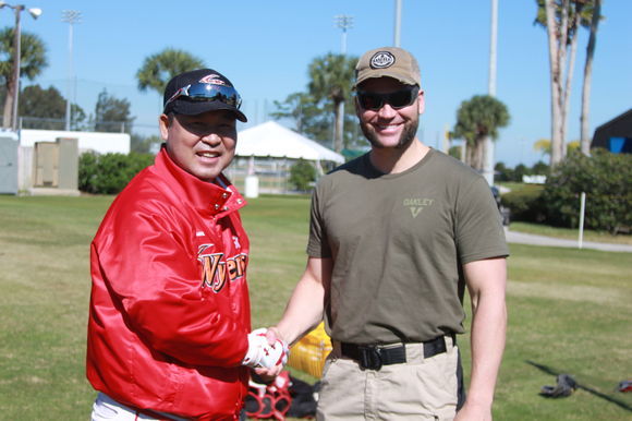 SK 캠프에 합류해 이만수 감독을 만난 스캇(위). SK 선수단에 바깥쪽 대처에 관련된 내용을 설명하고 있는 스캇(아래). SK 와이번스 제공.