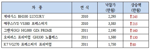 총 출품 차량은 371대로 이 중 220대가 낙찰됐으며, 경매 출품자 희망가 대비 낙찰가가 상승한 주요 차량은 표와 같다.