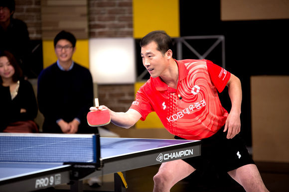 이 사진은 오는 2월 1일 밤 10시에 방송을 앞둔 '전설은 살아있다'의 설 특집 프로그램 '전설의 대결' 녹화 현장 사진으로 지난 22일 촬영 당시에 찍힌 것. 김택수가 신유빈의 공격을 받아내고 있다.