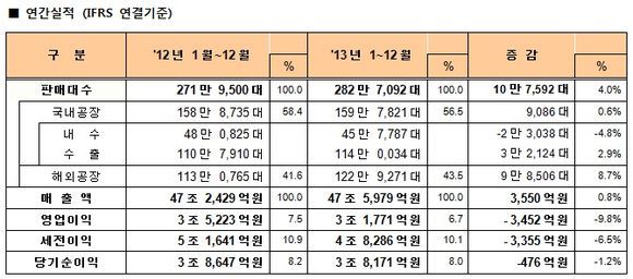 한편 4분기(10~12월) 기준으로는 원화 절상과 인건비 상승 등 경영환경은 좋지 않았지만, 전년 동기 대비 판매대수 및 판매단가가 상승한 데다가, 2012년 4분기 1회성 요인이었던 북미 연비 보상금 반영에 따른 기저효과로 영업이익은 60.8% 증가했다.