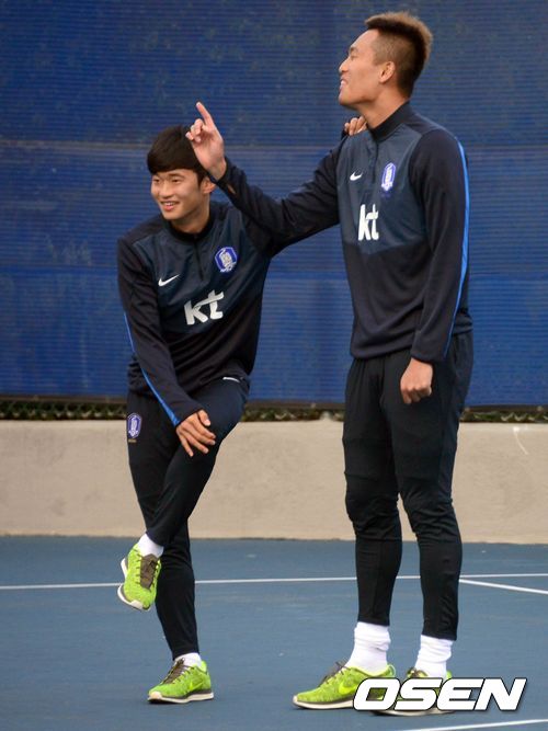 훈련에 앞서 농구 림을 점프로 잡는 내기에서 김진수가 실패하자 김신욱이 웃고 있다./spjj@osen.co.kr