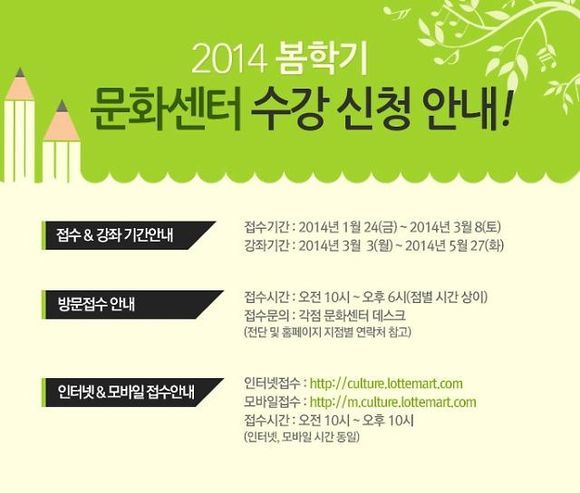 롯데마트 문화센터 또한 24일부터 3월 8일까지 회원을 모집하며, 강좌기간은 3월 3일부터 5월 27일까지다. 인터넷과 모바일을 통해 접수할 수 있다.