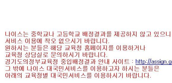 그러나 나이스에서는 중학교, 고등학교 배정 확인 방법을 알 수 없다. 실제로 나이스 사이트를 방문하면 ‘나이스 대국민서비스에서는 중고등학교 배정결과를 확인할 수 없다. 해당 교육지원청으로 문의하라’는 팝업 메시지가 뜬다.