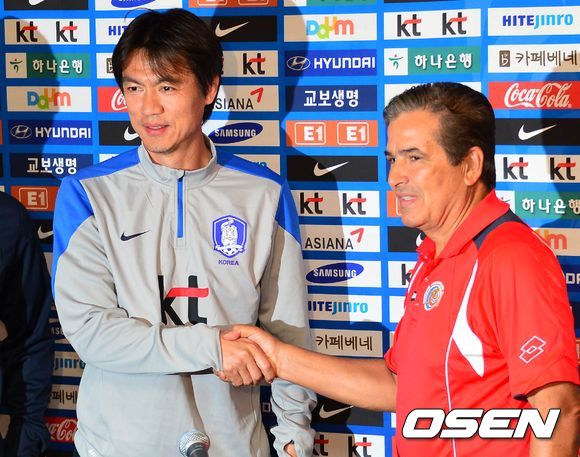 홍명보 감독이 뒤늦게 나타난 코스타리카 루이스 핀토 감독과 악수를 나누고 있다./spjj@osen.co.kr